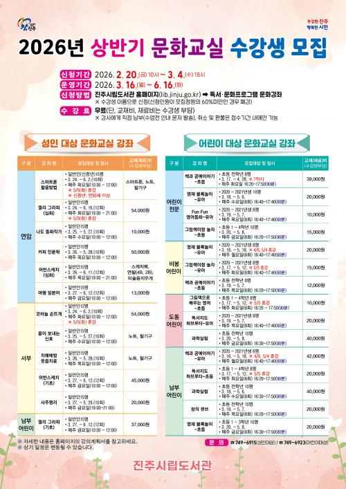 [È£ÅÚ°ü±¤·¹Á®½Å¹® °æ³²ÁøÁÖ=³²±Ã¿µ±â±âÀÚ] ÁøÁֽø³µµ¼­°üÀº ¿À´Â 20ÀϺÎÅÍ ¾î¸°ÀÌ¿Í ¼ºÀÎÀ» ´ë»óÀ¸·Î ¡®2026³â »ó¹Ý±â ¹®È­±³½Ç¡¯ ¼ö°­»ýÀ» ¸ðÁýÇÑ´Ù. ¡®¾î¸°ÀÌ ¹®È­±³½Ç¡¯Àº 3¿ù 16ÀϺÎÅÍ 5¿ù 18ÀϱîÁö ¾î¸°ÀÌÀü¹®¡¤µµµ¿¾î¸°ÀÌ¡¤ºñºÀ¾î¸°ÀÌ¡¤³²ºÎ¾î¸°À̵µ¼­°ü¿¡¼­¡¦